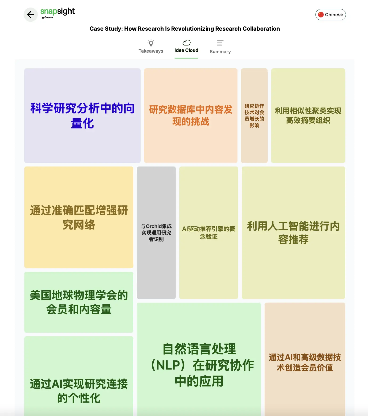 Traditional word clouds show frequency. Snapsight’s Idea Cloud reveals relationships, the conceptual architecture of the entire presentation. When you see seemingly unrelated terms connected in the visualization and think “that’s exactly the insight I was trying to formulate,” it’s because the system has mapped semantic relationships that exist in the content but might not be explicitly stated.